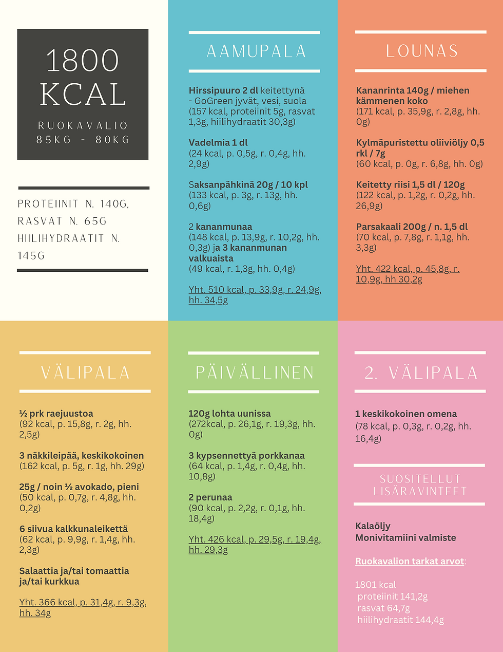 Perusruokavalioita on välillä 1200 - 3000 kcal.